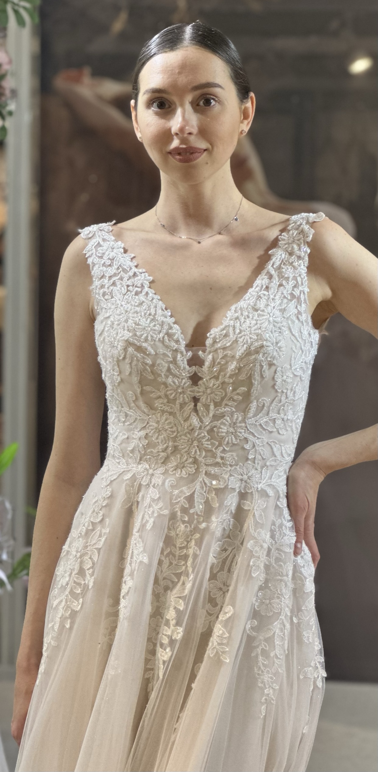 Delicate blush base with a sparkle tulle layer overlaid in Ivory & finished with Ivory beaded lace.