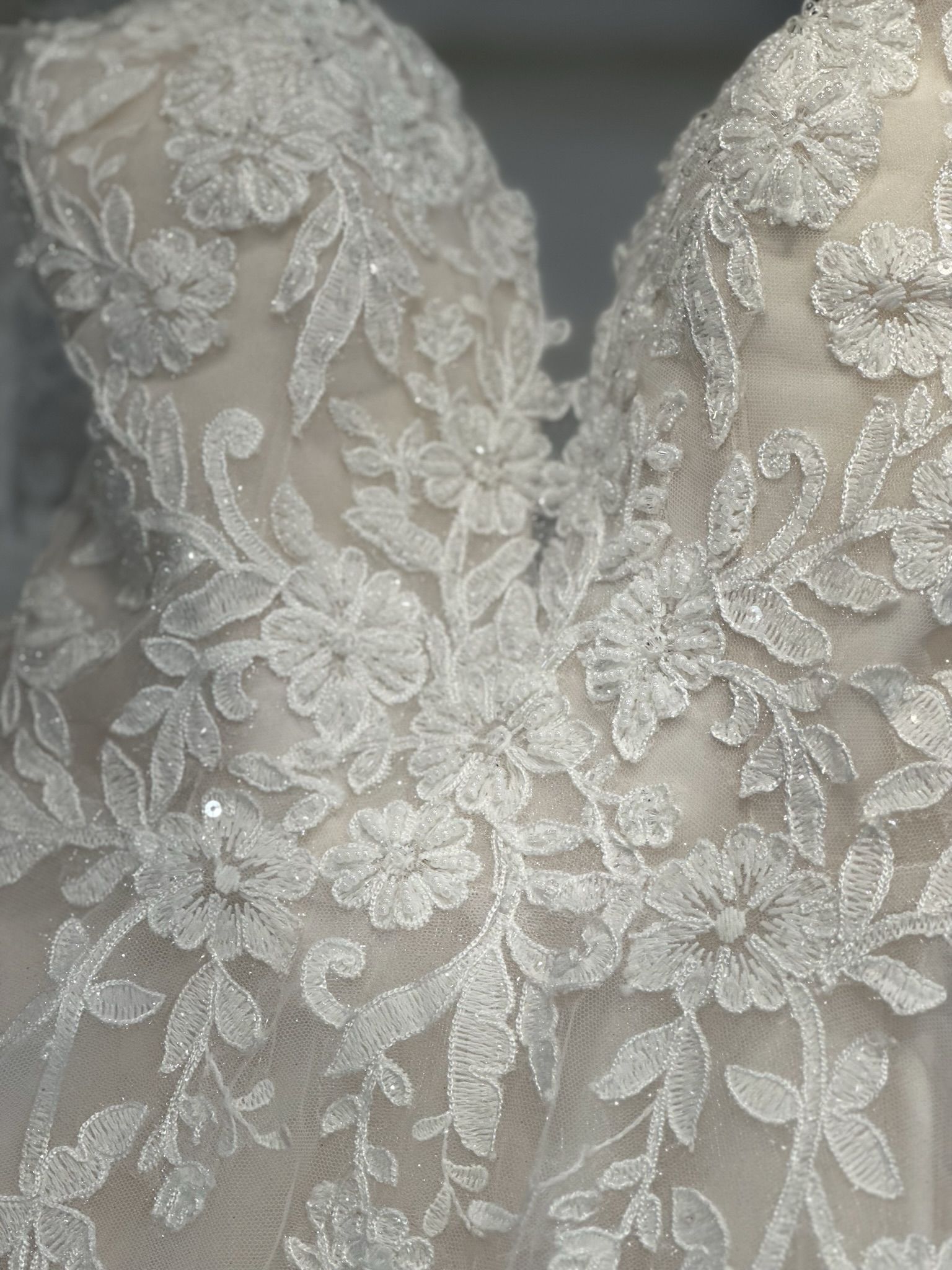 In stock as pictured Ivory/Blush in size UK 16. £1,200. Also available in all ivory or Ivory/Nude
