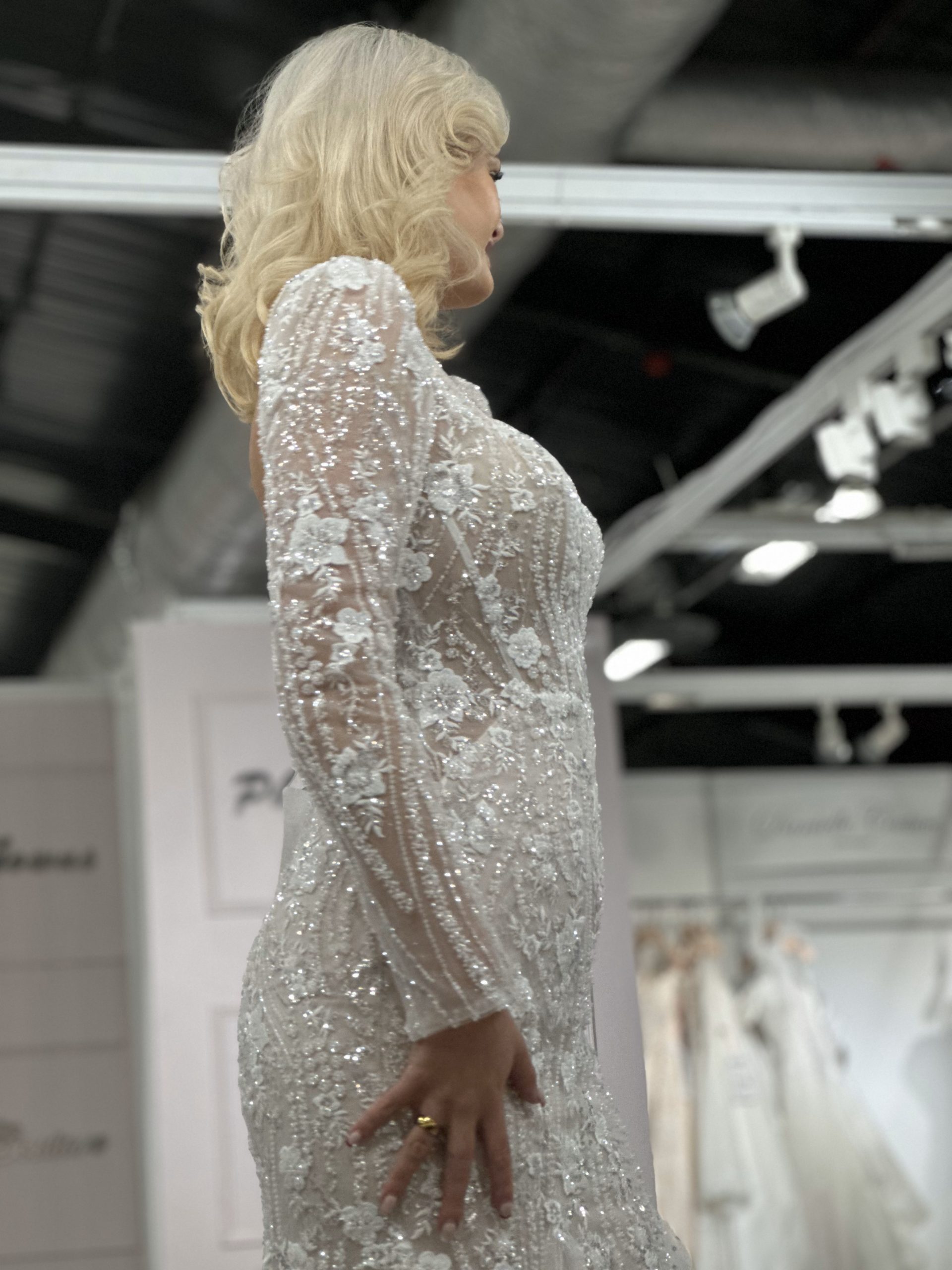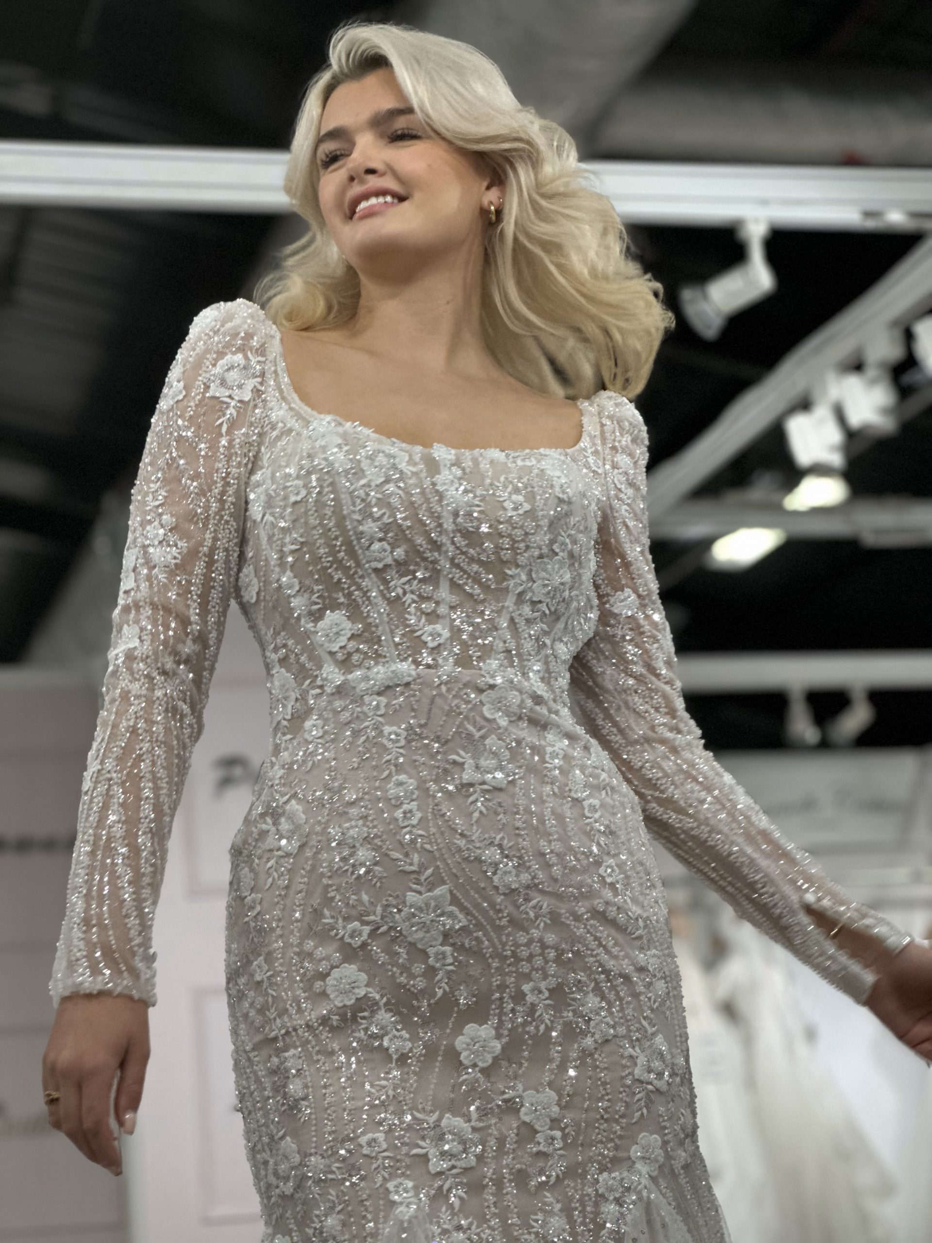 A vision of delicate lace cascading over a figure-hugging silhouette. The square neckline frames the décolletage with a clean, architectural line, offering a refreshing alternative to traditional sweetheart or V-necks. Fitted sleeves crafted from the same intricate lace as the bodice add a touch of sophisticated coverage, perfect for a cooler season or a demure yet stylish bride. As the dress flows downwards, it gracefully hugs the hips before dramatically flaring into a stunning fishtail skirt, a timeless design that emphasizes curves and creates a breathtaking train as the bride walks down the aisle. The addition of sparkle elevates the look from simply beautiful to truly unforgettable, catching the light with every movement and leaving a trail of enchantment in its wake.