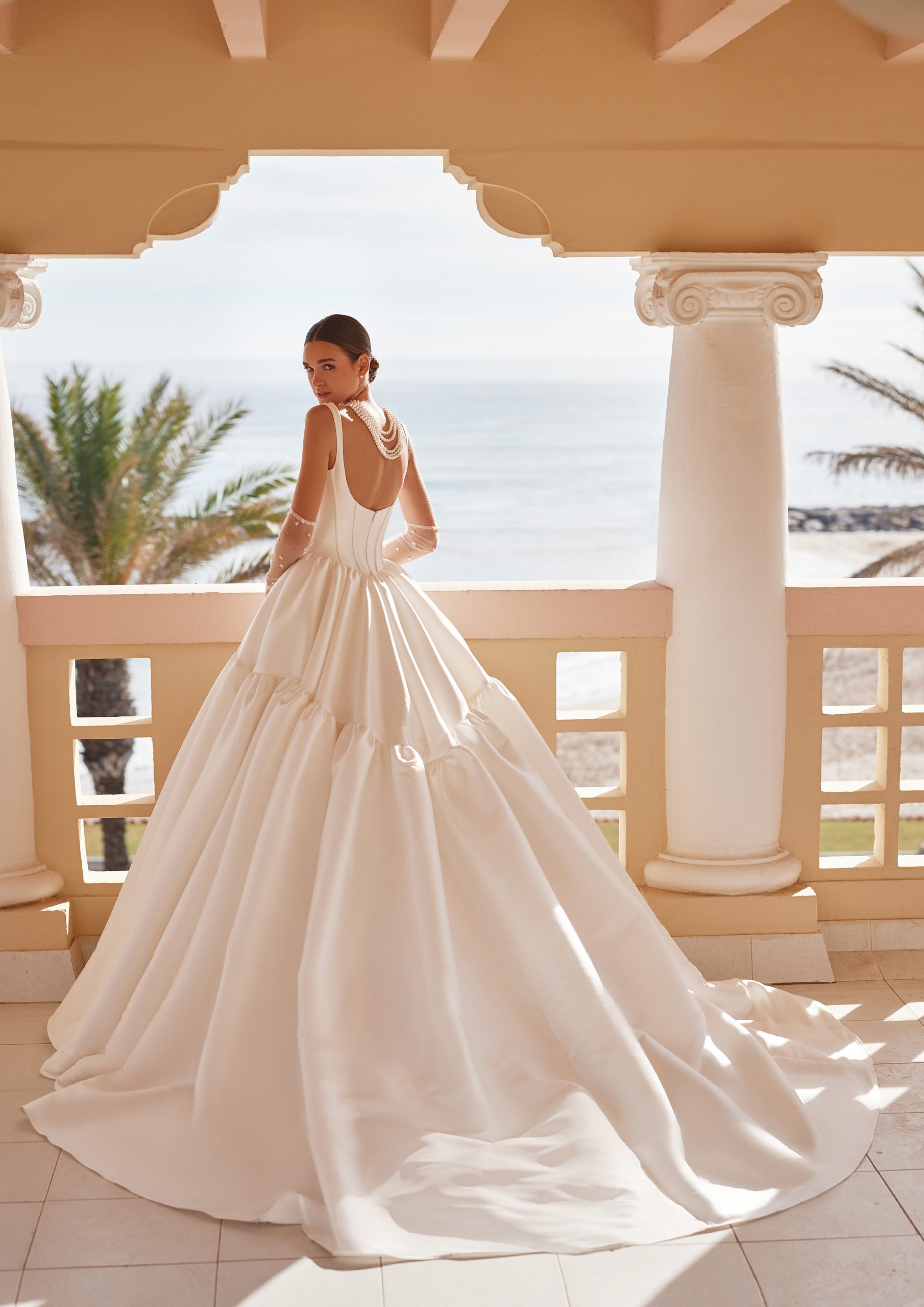 This exquisite gown features a structured bodice with a modern, square neckline, creating a striking and elegant silhouette. The full skirt adds a touch of romance and allows for graceful movement. Intricate corseting detail enhances the figure and provides support, ensuring a flattering and comfortable fit. For added versatility, the design includes both a two-tiered skirt option for a more dramatic effect and a plain skirt for a classic, understated look. As a practical yet luxurious touch, discreet pockets are seamlessly integrated into the design.