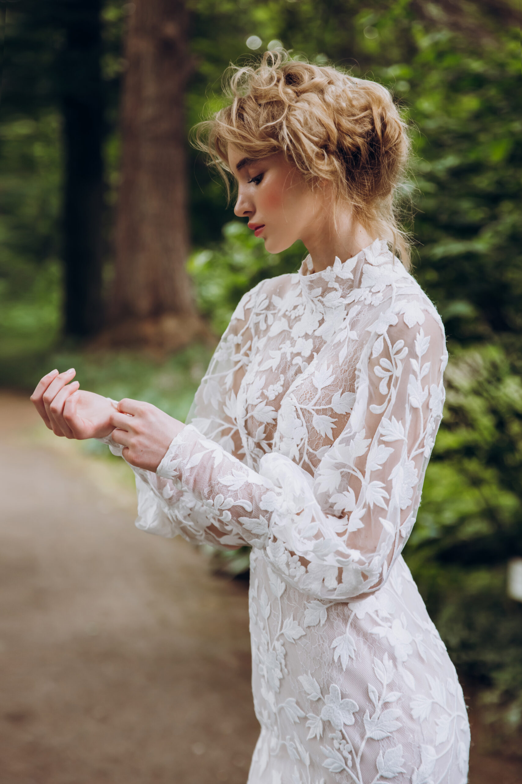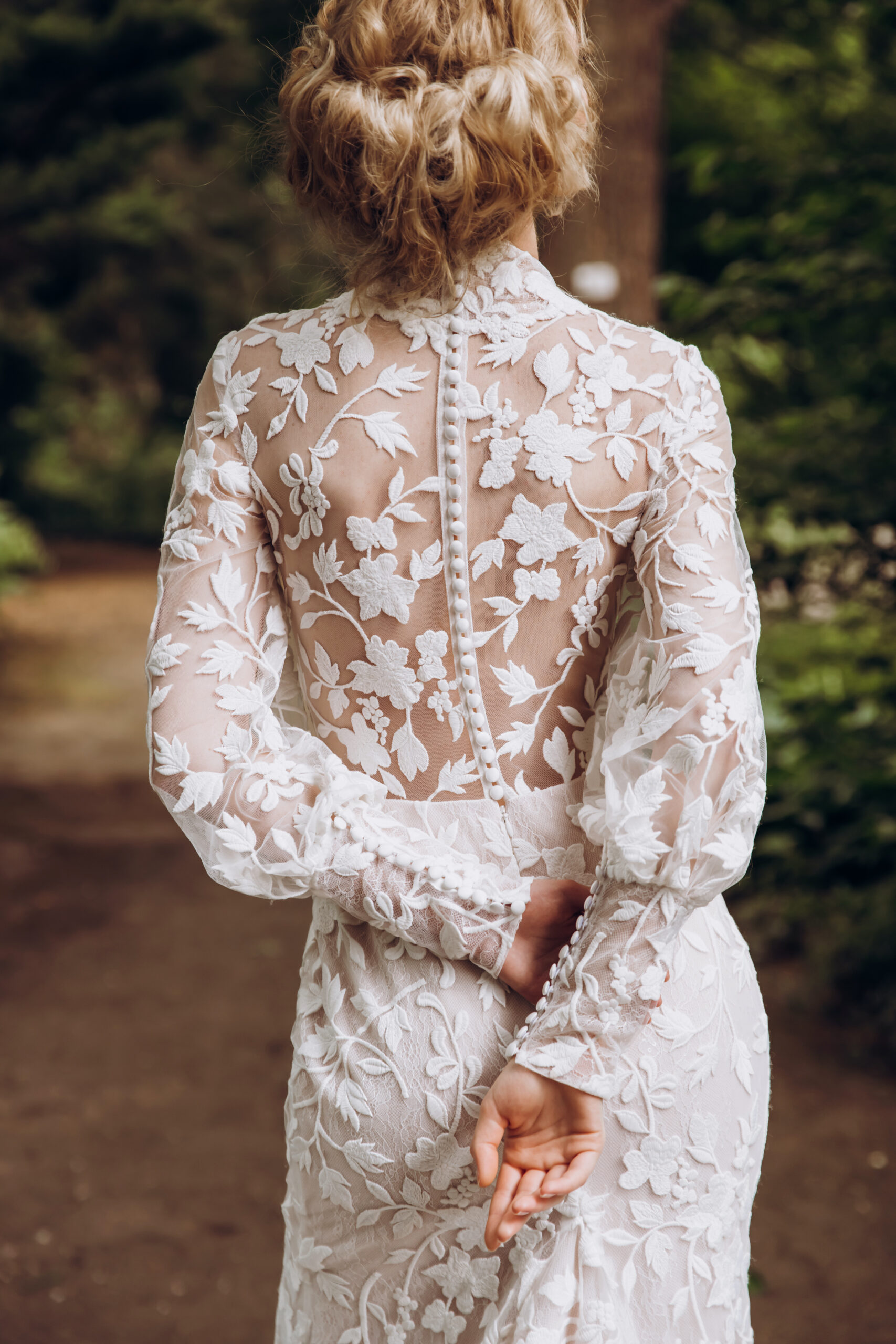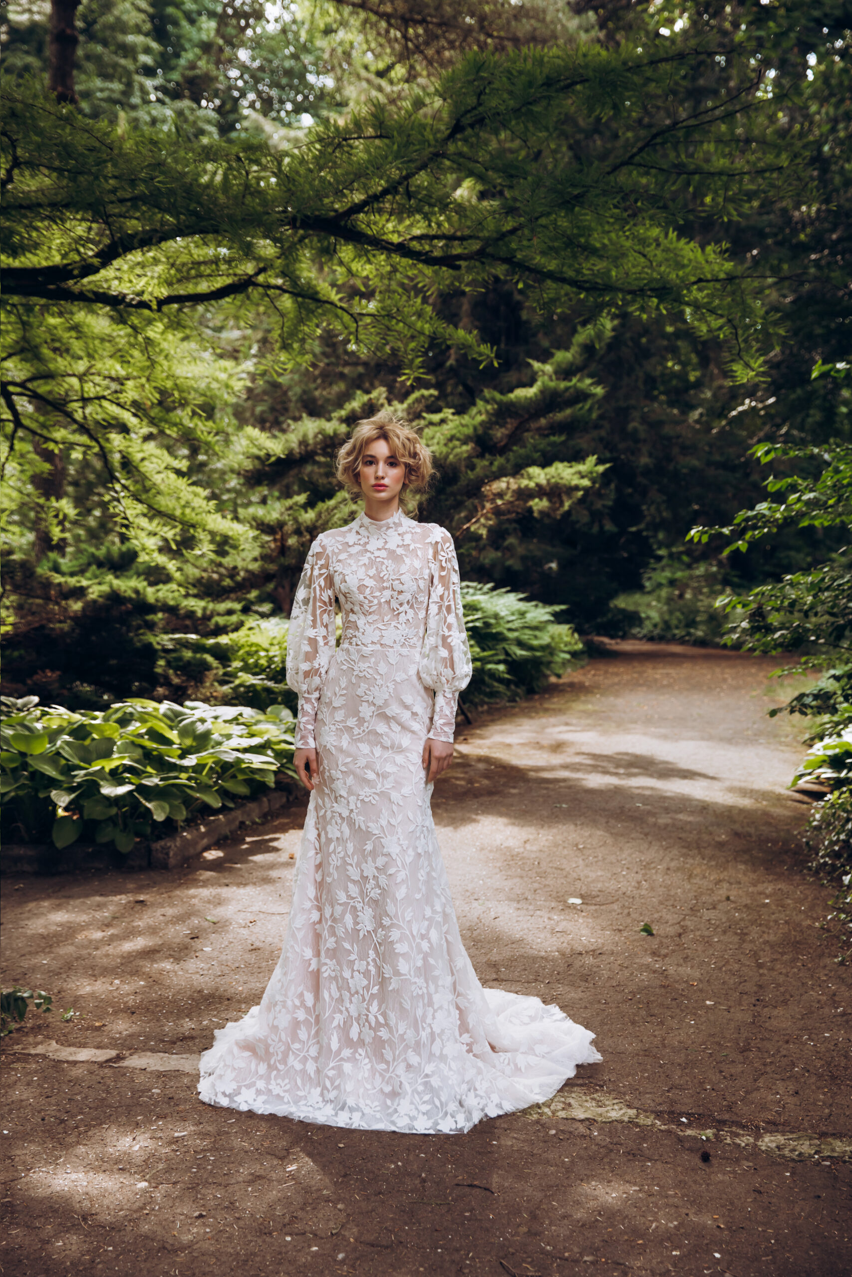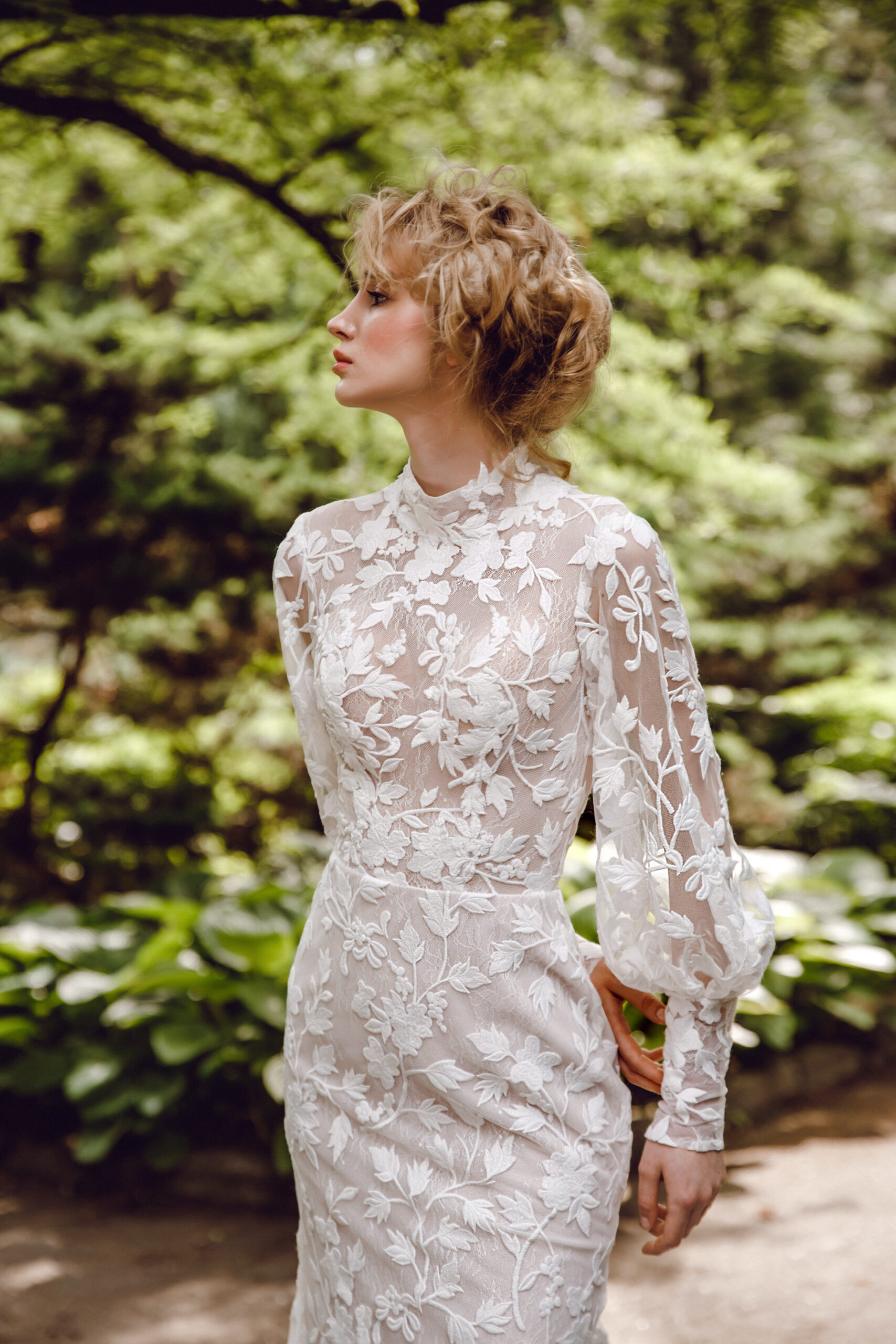 Introducing a charming modest lace fit and flare wedding dress that beautifully melds classic elegance with modern details. This exquisite gown features a delicate collar that frames the face and adds a touch of sophistication. The gigot lace sleeves offer a romantic flair, with button details that enhance the overall design, creating an eye-catching focal point. The fit and flare silhouette hugs the body in all the right places before gracefully flaring out, providing a flattering shape that accentuates your figure. Crafted from high-quality lace, the intricate patterns add texture and depth, making this dress a timeless choice for your special day.