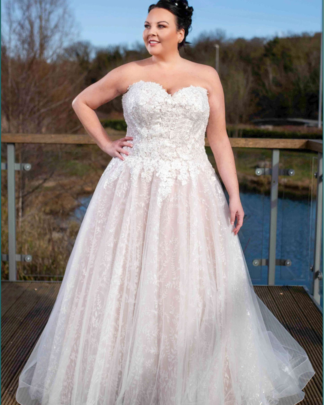 A wedding dress that captures the light with every movement, a strapless gown that’s both breathtaking and effortlessly romantic. The bodice, a meticulously crafted corset back, provides a sculpted silhouette, offering both structure and a touch of vintage charm. Tiny crystals are woven throughout, creating a subtle sparkle that dances in the candlelight. The skirt, a classic A-line, flows away from the body with a graceful ease and a timeless shape. But the real magic lies in the subtle undertones of blush pink, peeking through the layers of shimmering fabric, adding a warmth and femininity that sets it apart from traditional ivory. It’s a dress that whispers of romance and modern fairytale, perfect for the bride who wants to feel both confident and utterly enchanting.