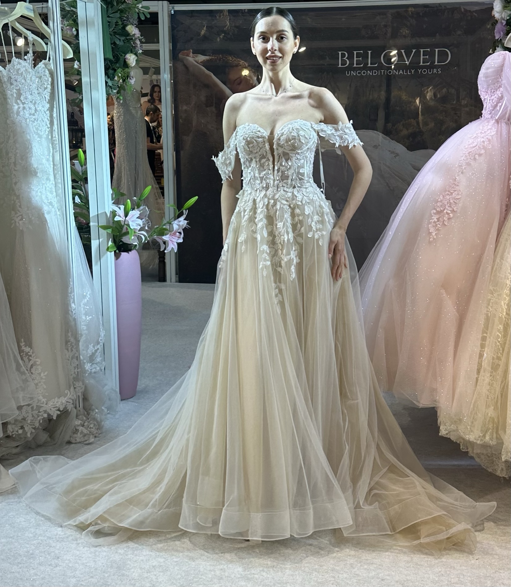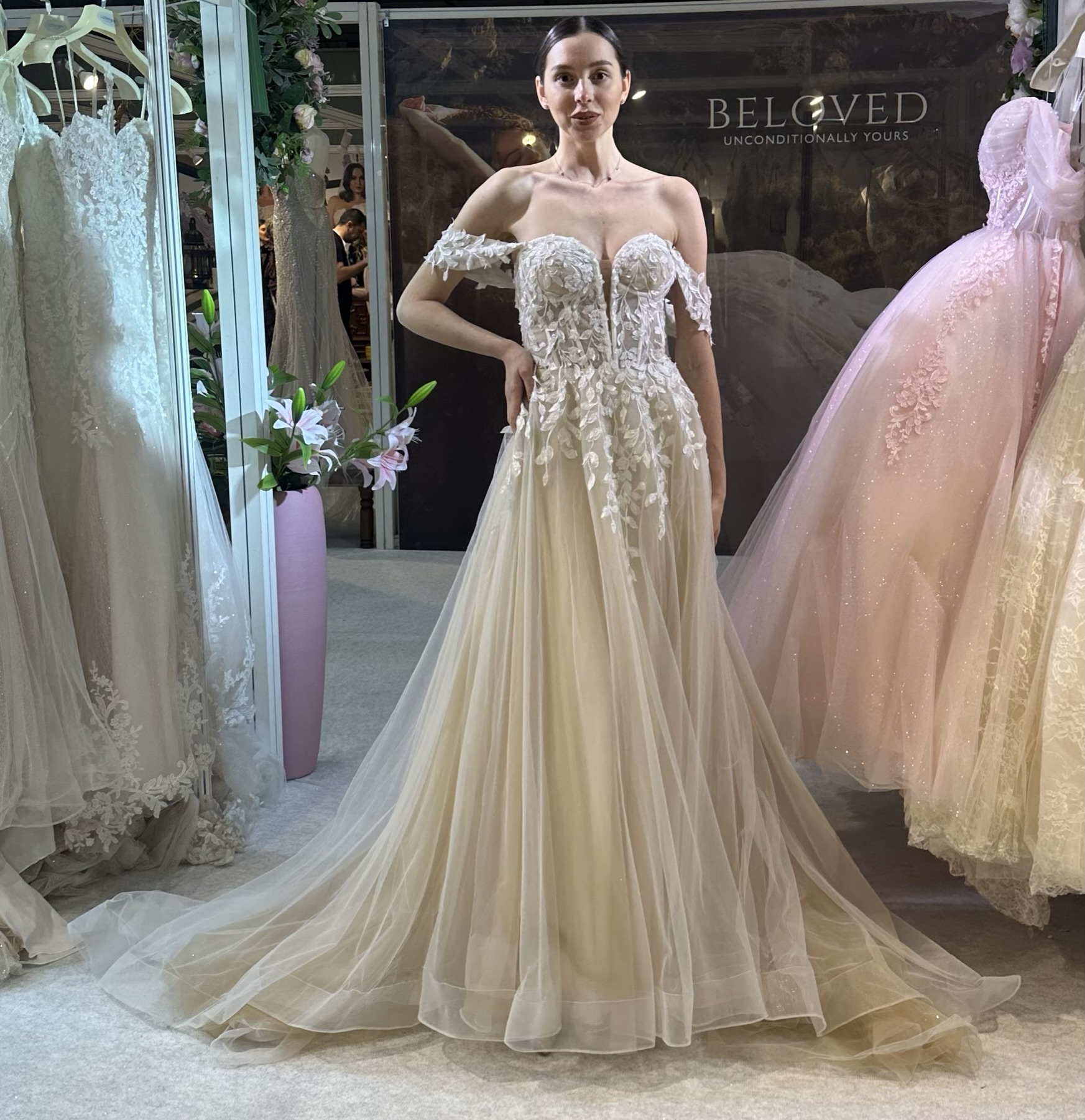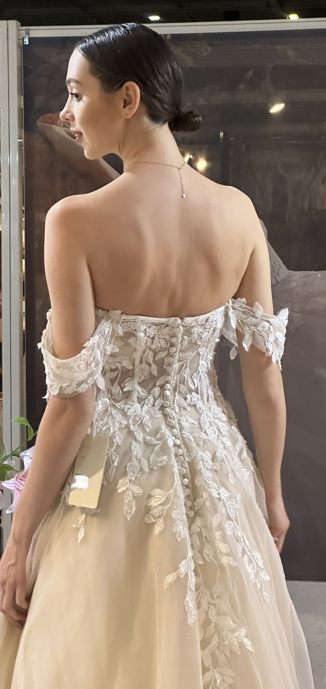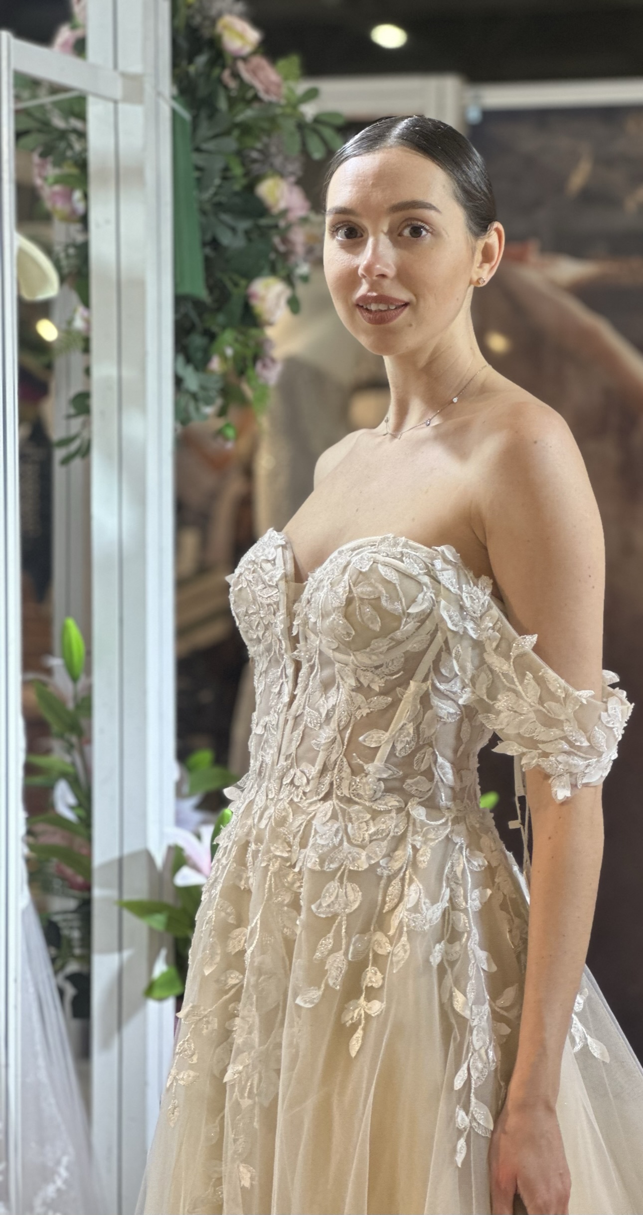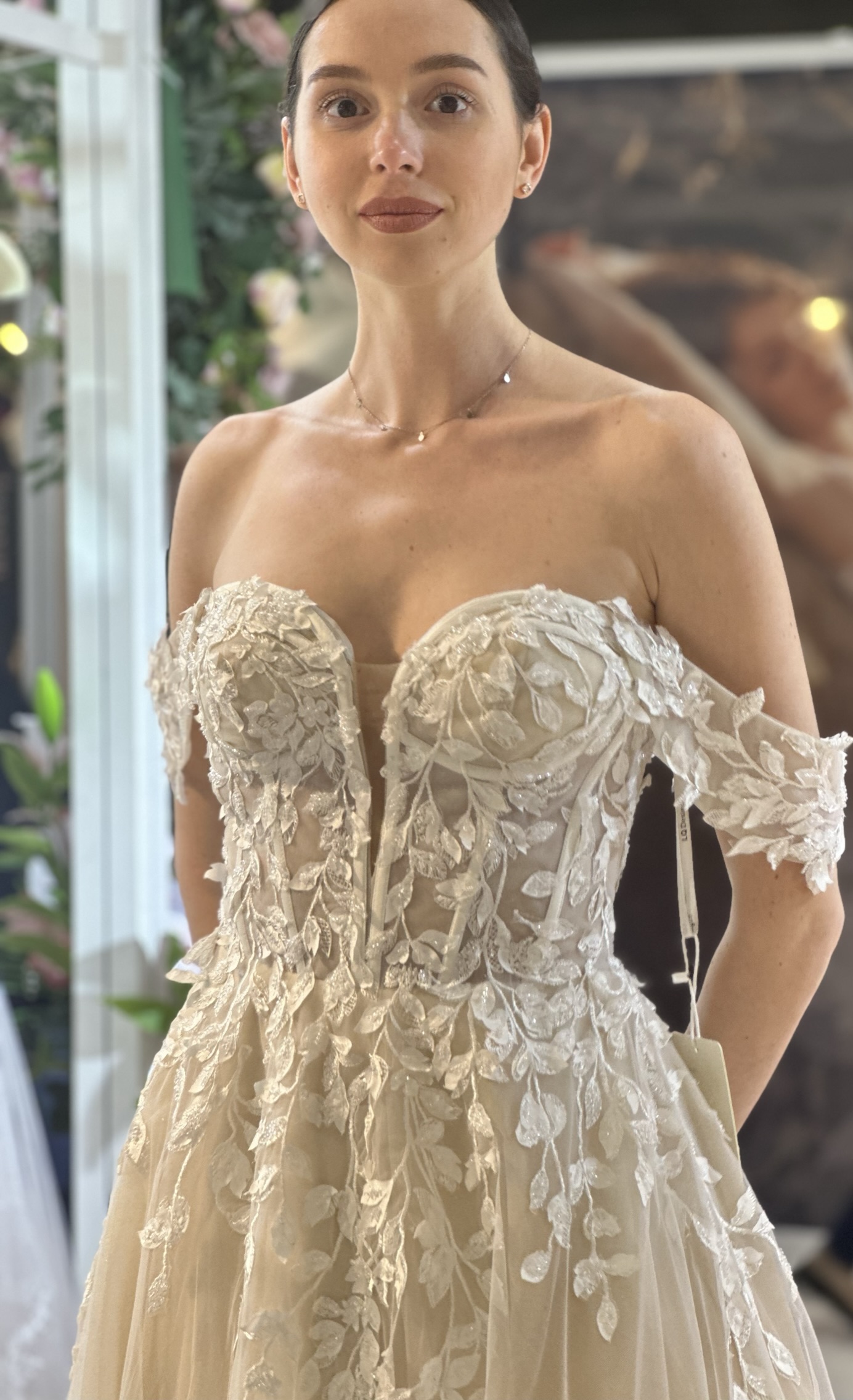 The corset bodice is a striking blend of structure and sensuality. Delicate lace, strategically layered, cascades down the gown, its intricate patterns adding depth and texture. The strapless design highlights the bride’s décolletage, while the exposed boning detail of the corset offered a contemporary edge, hinting at the craftsmanship beneath the delicate fabric. Sparkling beaded accents catch the light with every movement, adding a touch of ethereal glamour. For a versatile touch, detachable Bardot straps offer the option for a more traditional or demure look during the ceremony, easily removed for a confident, strapless silhouette for the reception, allowing the bride to personalize her style throughout the day.