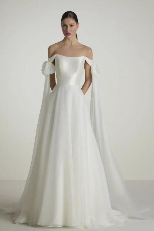 The A-line silhouette of this wedding dress offers a universally flattering shape, skimming the hips and flowing gracefully into a wider skirt constructed from layers of ethereal organza & tulle. This creates a light and airy feeling, perfect for a romantic and whimsical bride. The drama is elevated by the Mikado off-shoulder neckline, a sophisticated and modern touch that frames the décolletage beautifully. But the true showstopper lies in the delicate shoulder bows, adding a touch of playful femininity to this otherwise classic design. The contrast between the structured Mikado and the delicate organza and bows creates a captivating balance, resulting in a gown that is both elegant and unforgettable.