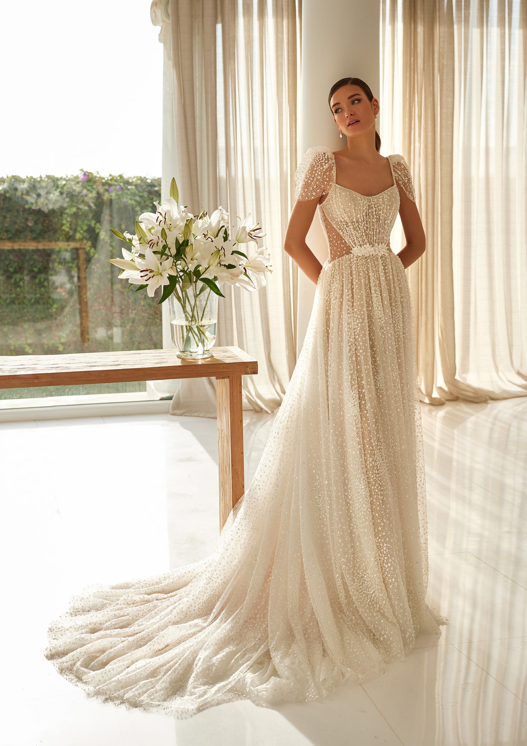 See yourself gliding down the aisle in an A-line wedding dress crafted from shimmering beaded glitter fabric, catching the light with every movement. The gown exudes effortless elegance, flattering the figure with its classic silhouette. What truly sets it apart is the detachable short-sleeves bodice. Adorned with delicate beadwork, the bodice offers a modern and versatile look. Illusion panels strategically placed, highlighting the waistline and back, add a touch of ethereal romance, creating a breathtaking vision of contemporary bridal style.