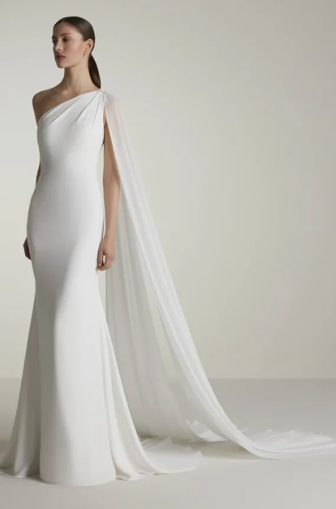 The mermaid wedding dress, a classic silhouette known for its figure-hugging bodice and dramatic flare at the knees, takes a modern turn with an asymmetrical neckline and artfully designed chiffon shoulder drapes. Crafted from luxurious crepe, the gown drapes beautifully, offering a smooth, clean aesthetic that highlights the body’s natural curves. The combination of these elements results in a sophisticated and unforgettable bridal look, perfect for the bride who seeks a balance between timeless romance and bold, fashion-forward design.