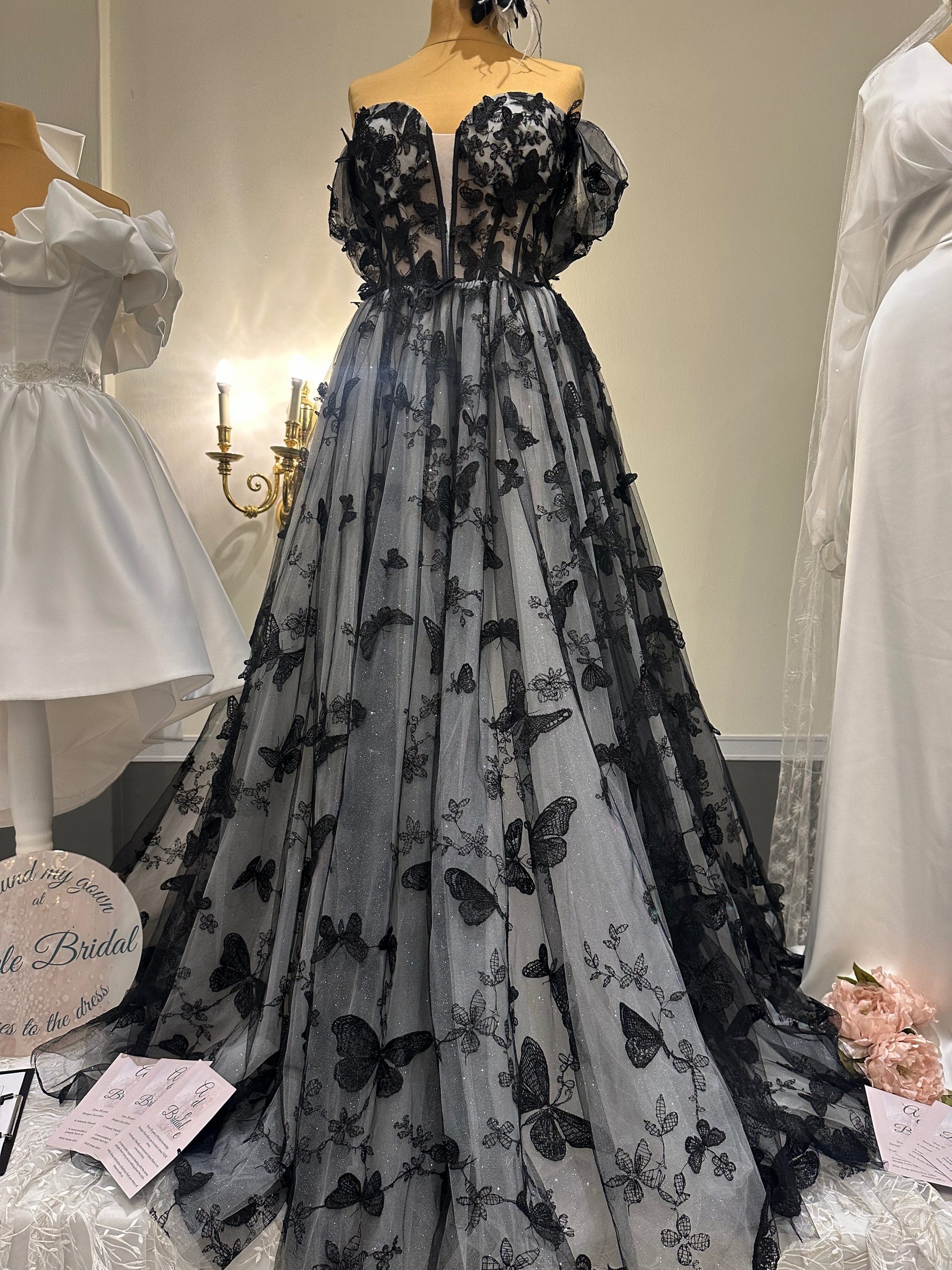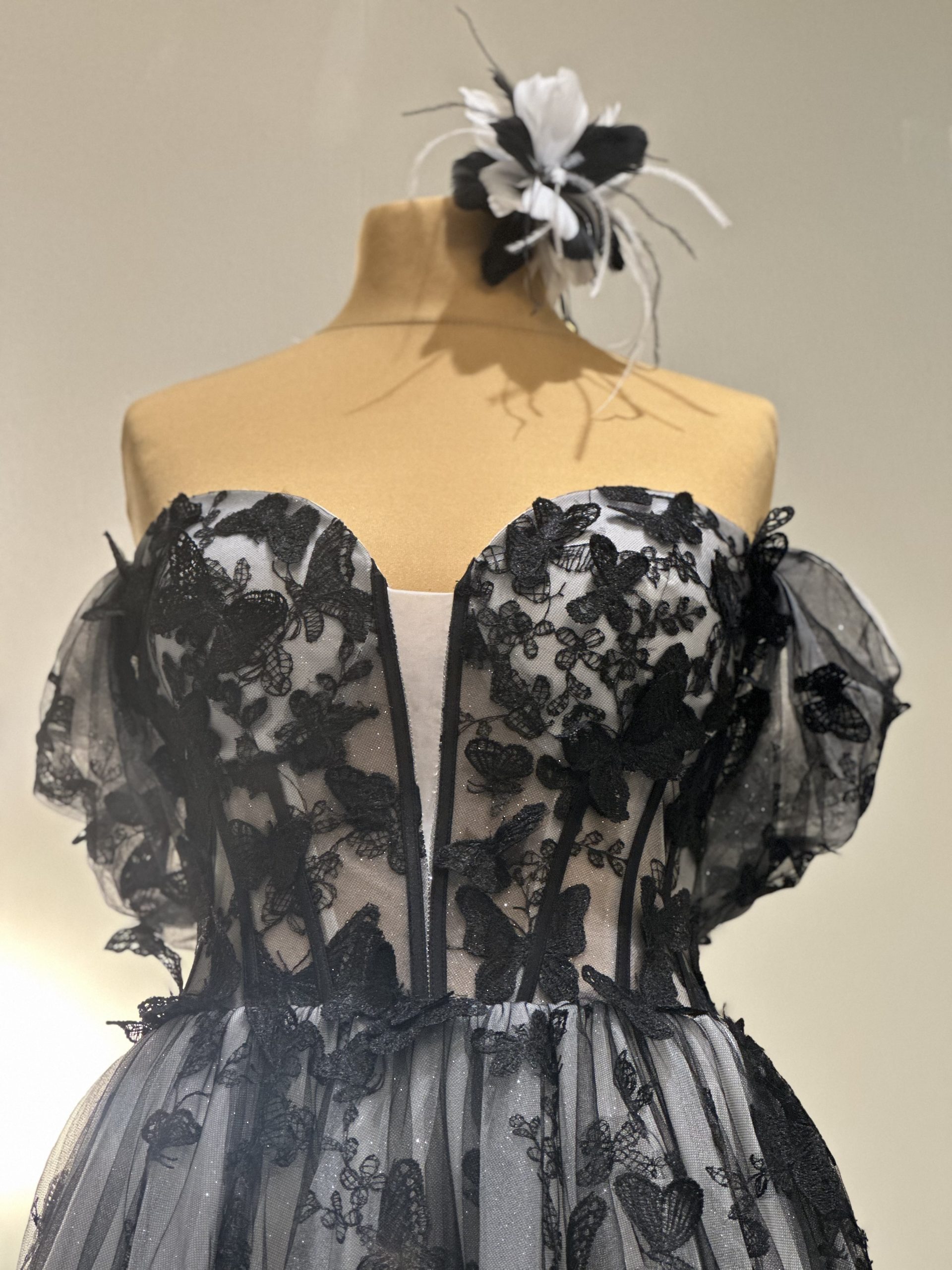This strapless wedding dress begins with a foundation of soft ivory, creating a warm and flattering canvas. Exquisite black lace, a bold and sophisticated choice, layered over the bodice and flowing down the skirt, adding depth and intricate detail. Layers of shimmering glitter tulle, almost like captured starlight, dance over the ivory base, catching the light with every movement and creating a dreamy, ethereal effect. For a versatile touch, detachable bardot sleeves, crafted from the same delicate lace, offer the bride the option to transform her look from classically elegant to playfully romantic throughout the day. This gown is a statement piece, a perfect blend of dark and light, vintage and modern, designed for the bride who dares to be different.