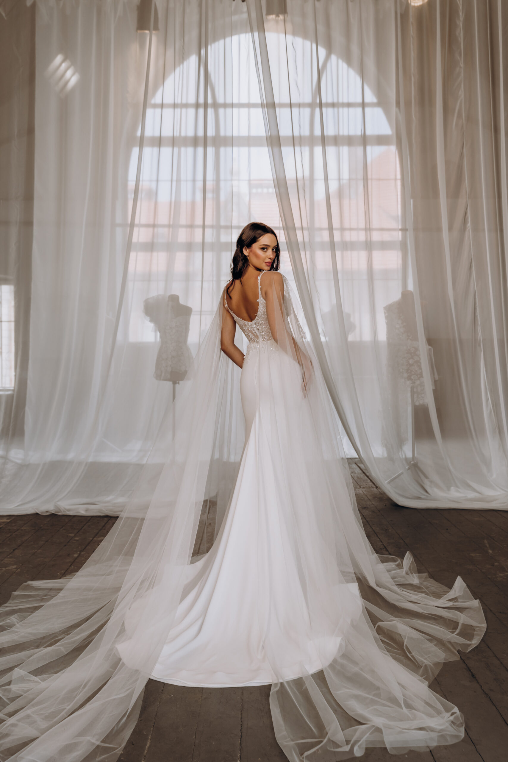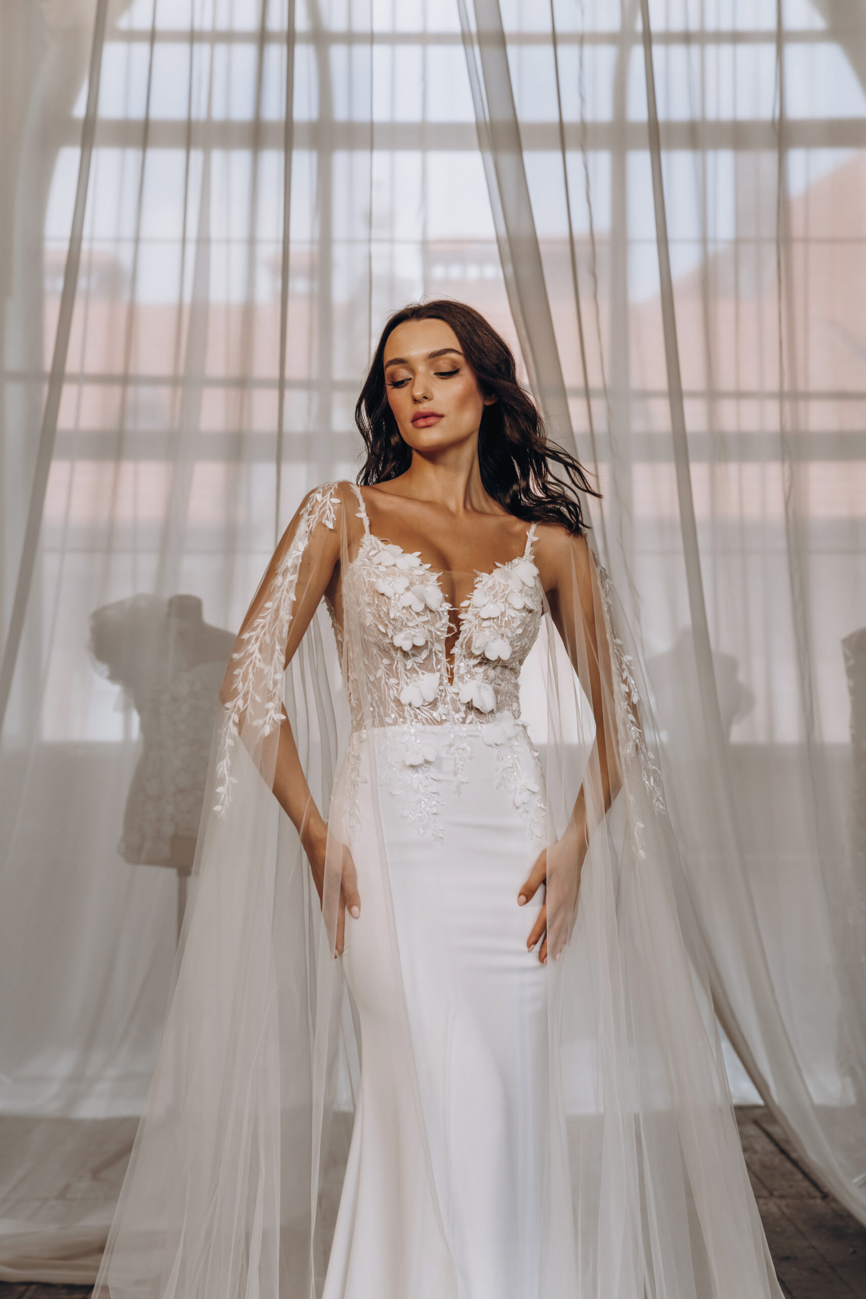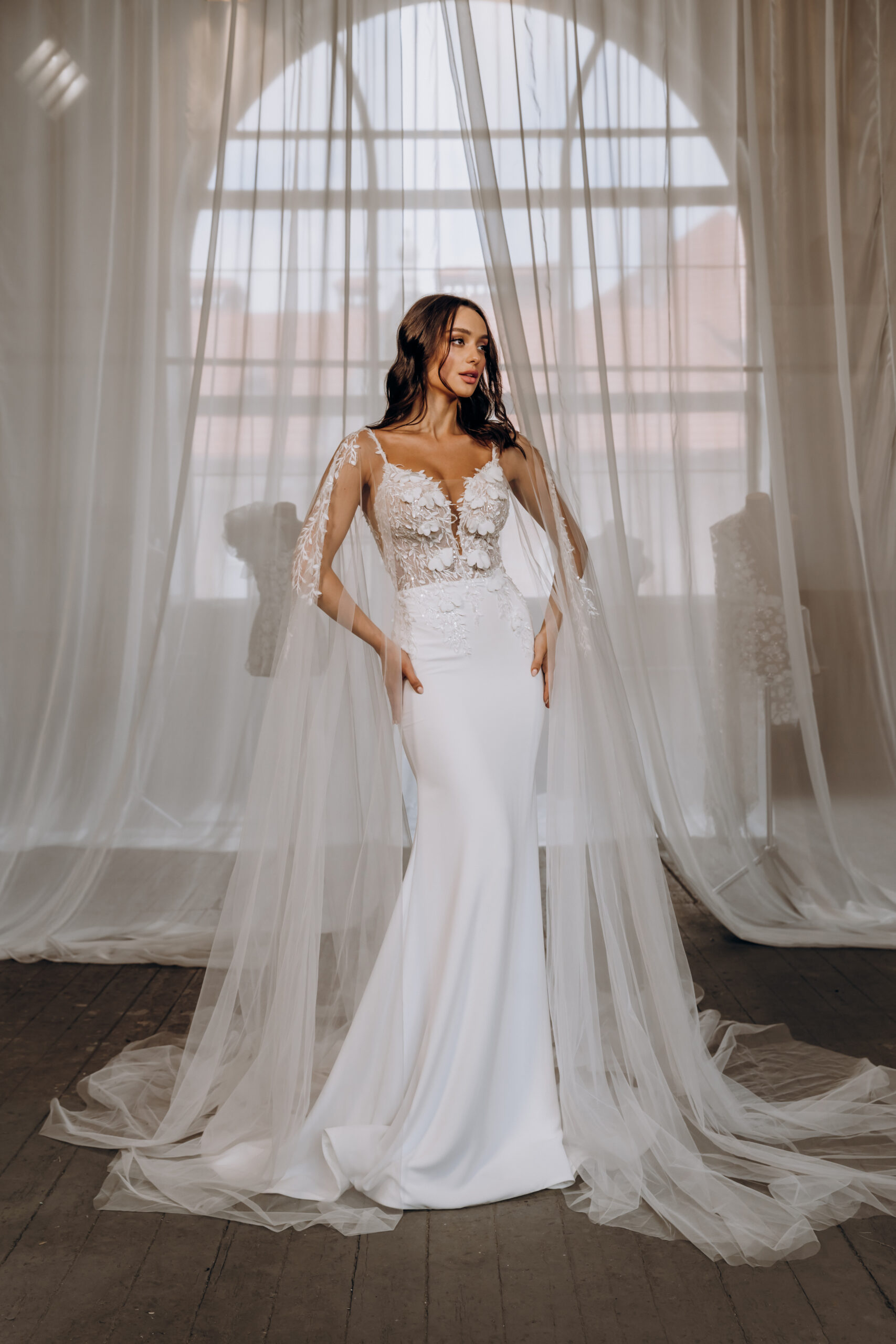 This ensemble strikes a delicate balance between modern sophistication and ethereal romance. The foundation is a fishtail crepe skirt, its fluid drape skimming the hips before flaring dramatically at the hem, creating a captivating silhouette. The lace bodice, adorned with slender straps, offers a touch of alluring femininity, showcasing intricate floral patterns and delicate textures. For a customizable touch, the detachable tulle with lace shoulder drapes adds an element of whimsical grandeur. These ethereal drapes, cascading gracefully from the shoulders, can transform the look from sleek and contemporary to dreamily traditional, offering versatility. The interplay of textures creates a visually stunning and unforgettable statement.
