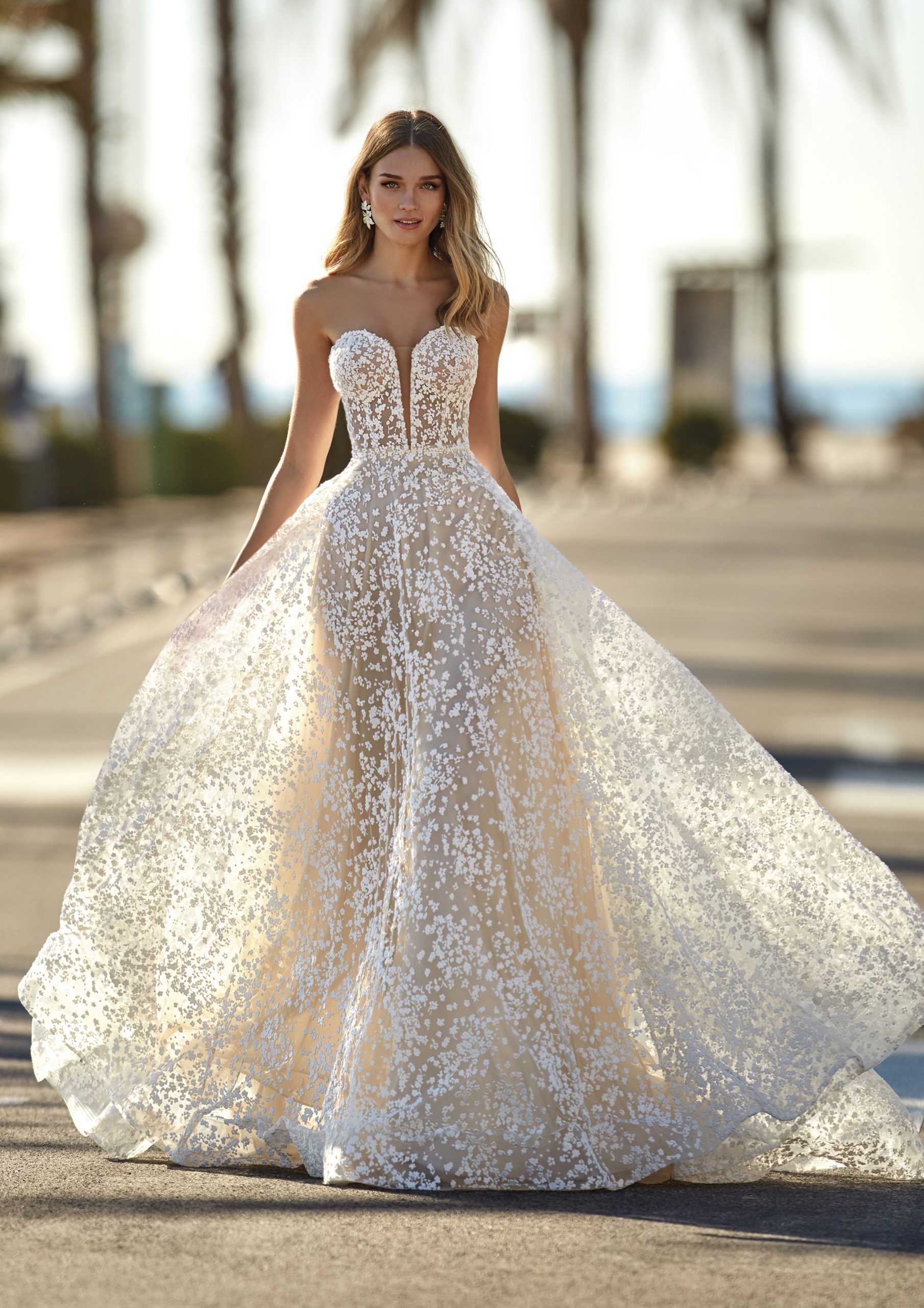 A strapless A-line wedding dress, the epitome of modern romance. The silhouette is effortlessly flattering, skimming your figure before gracefully flowing into a full skirt. But the real magic lies in the fabric: glittery, textured tulle. It’s not just shimmering fabric; it’s a constellation of tiny lights woven into a tactile surface, creating a mesmerizing play of light and shadow with every move. The strapless neckline highlights your shoulders and décolletage, while the A-line shape provides comfort and freedom of movement, allowing you to dance the night away in glittering style. This is a dress that’s both whimsical and sophisticated, perfect for the bride who wants to sparkle without sacrificing elegance.
