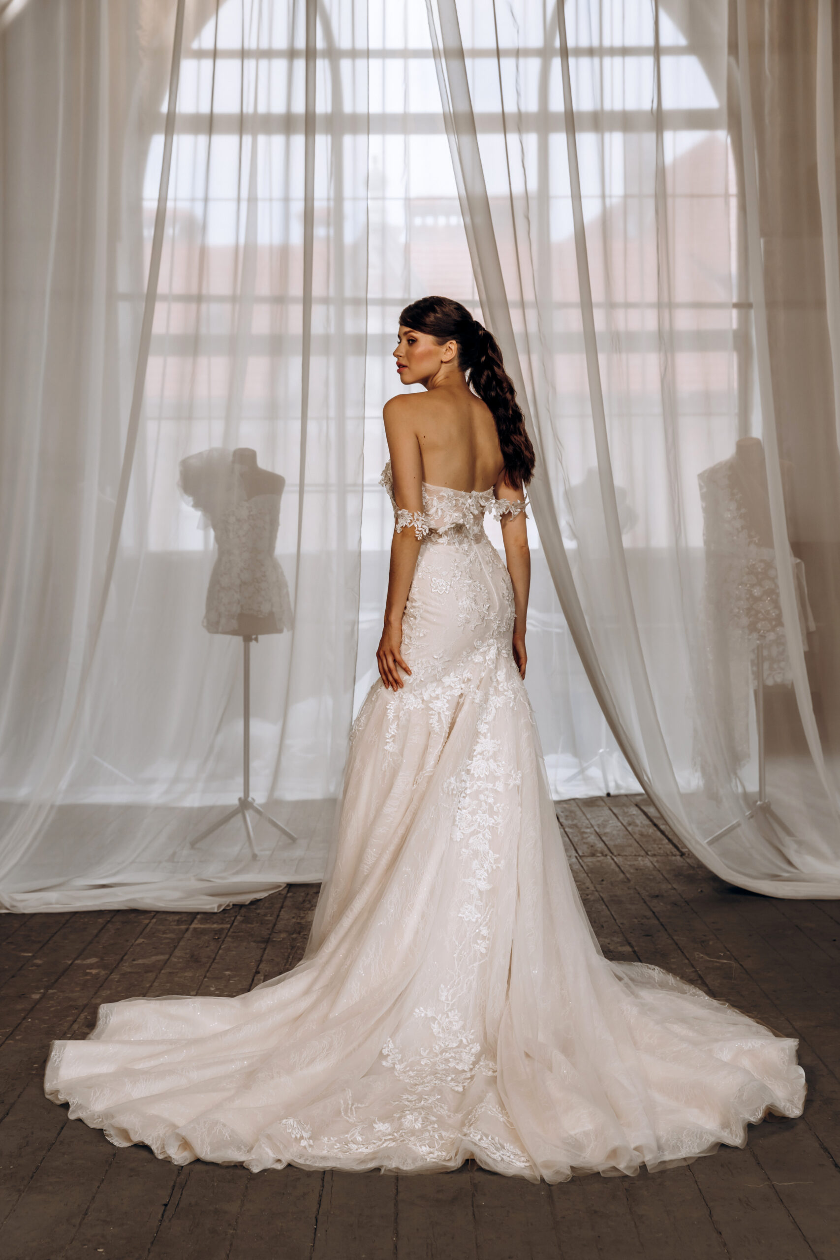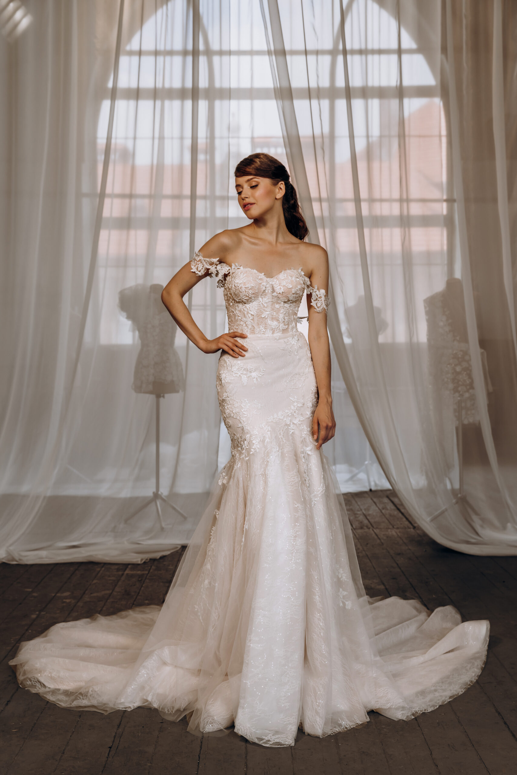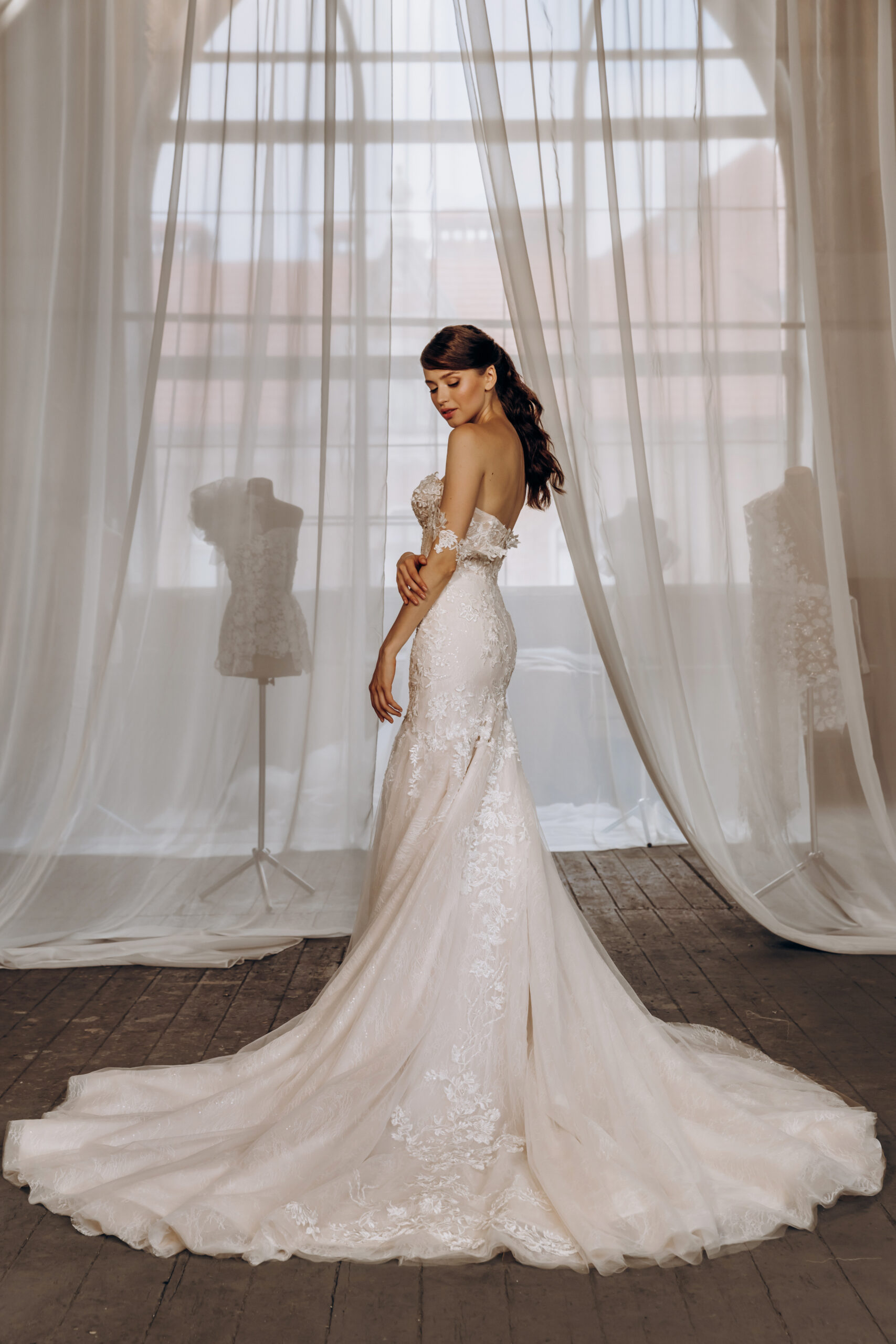 The mermaid lace wedding dress, with its dramatic silhouette and intricate detailing, is a vision of romantic elegance. Crafted with a champagne base, the gown boasts a warm, subtle glow. The delicate lace overlay, cascading down the body enhances the figure-hugging shape, flaring out gracefully from the knees for a breathtaking finale. Adding to the allure is the bardot shoulder neckline, showcasing the bride’s décolletage with effortless sophistication. The combination of these elements creates a dress that is both sensual and refined, perfect for a bride seeking a show-stopping gown with a touch of modern romance.